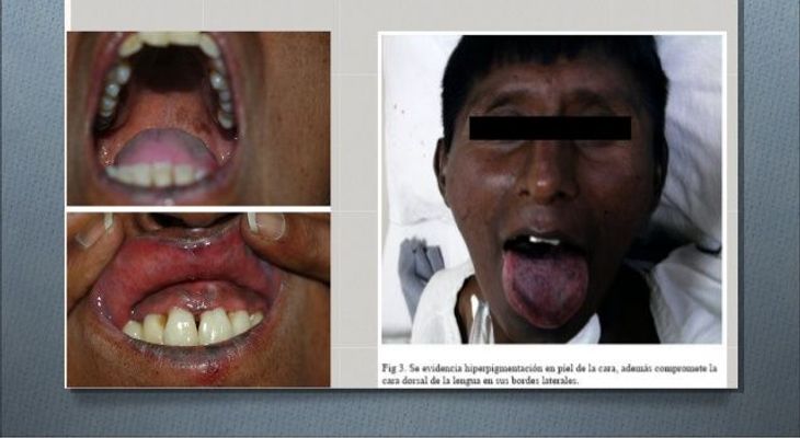Con frecuencia se identifican efélides o pecas de color oscuro en la frente, la cara, el cuello y los hombros. También aparecen áreas de vitiligo, además de cambios de coloración negro-azuladas en las aréolas y las mucosas de los labios, la boca, el recto y la vagina.