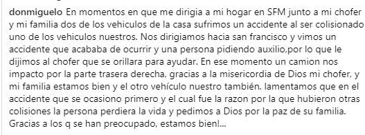 Se informó que “Don Miguelo”, quien andaba con su familia, se detuvo cuando ocurrió el accidente y su vehículo fue impactado por otro.