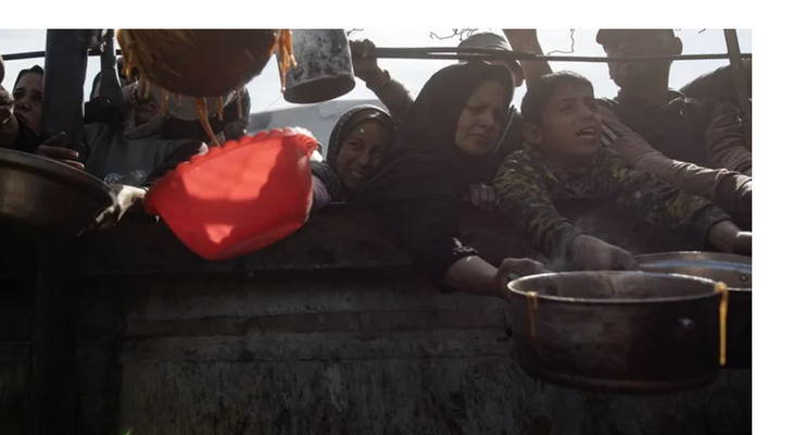 Palestinos desplazados, incluidos niños, se reúnen para recibir alimentos, en Khan Yunis, al sur de la Franja de Gaza. EFE/EPA/Haitham Imad