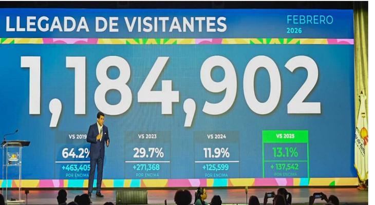 Dijo que la llegada de 1,184,902 en febrero, representa un crecimiento de un 13.1 % comparado con el mismo mes del 2025, un 11.9 % respecto al 2024 y un 64.2 % frente al 2019.