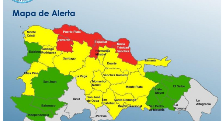 Se mantienen en alerta roja Puerto Plata, Espaillat, María Trinidad Sánchez y Valverde, mientras otras provincias continúan en alerta amarilla y verde.
